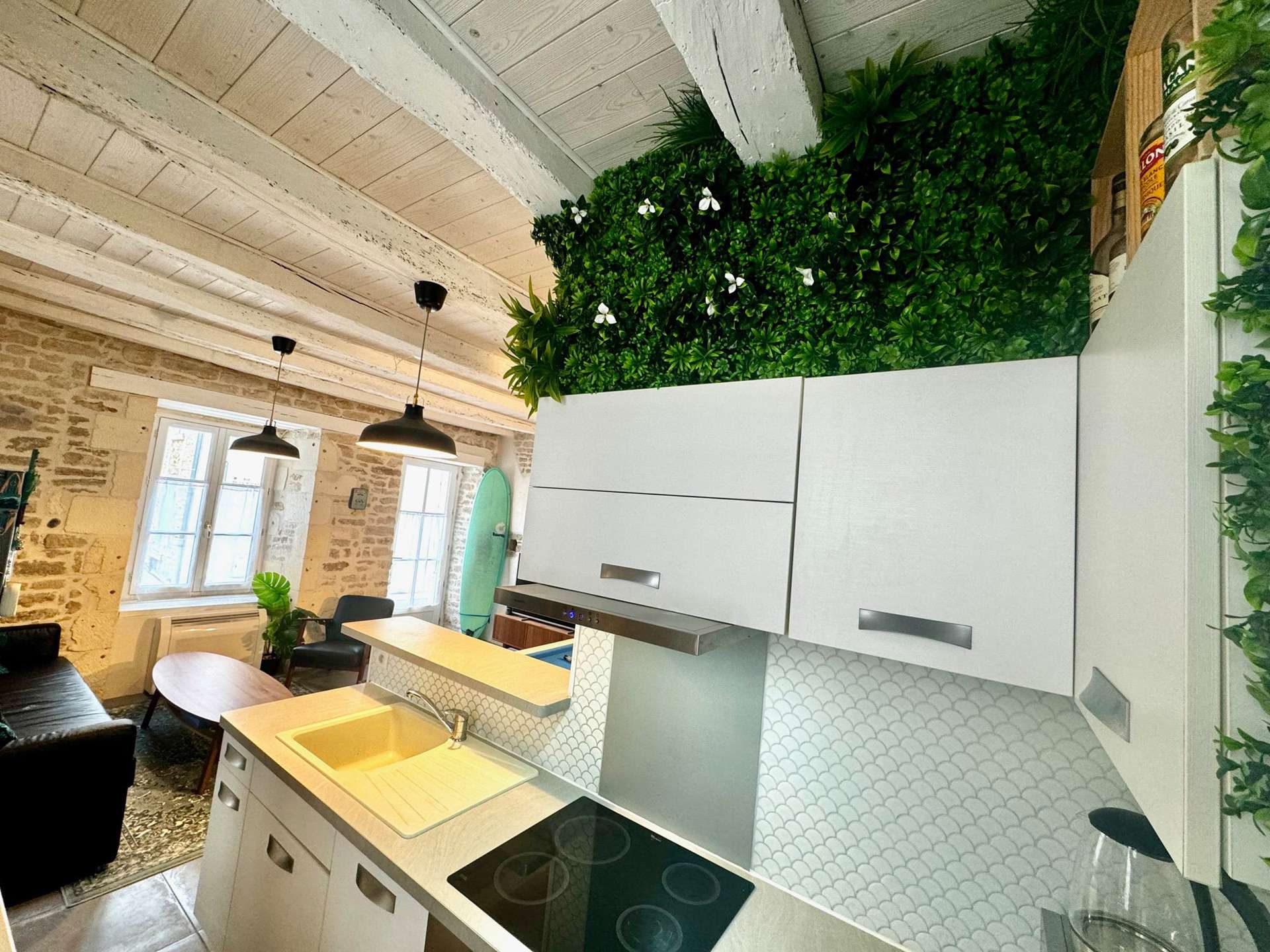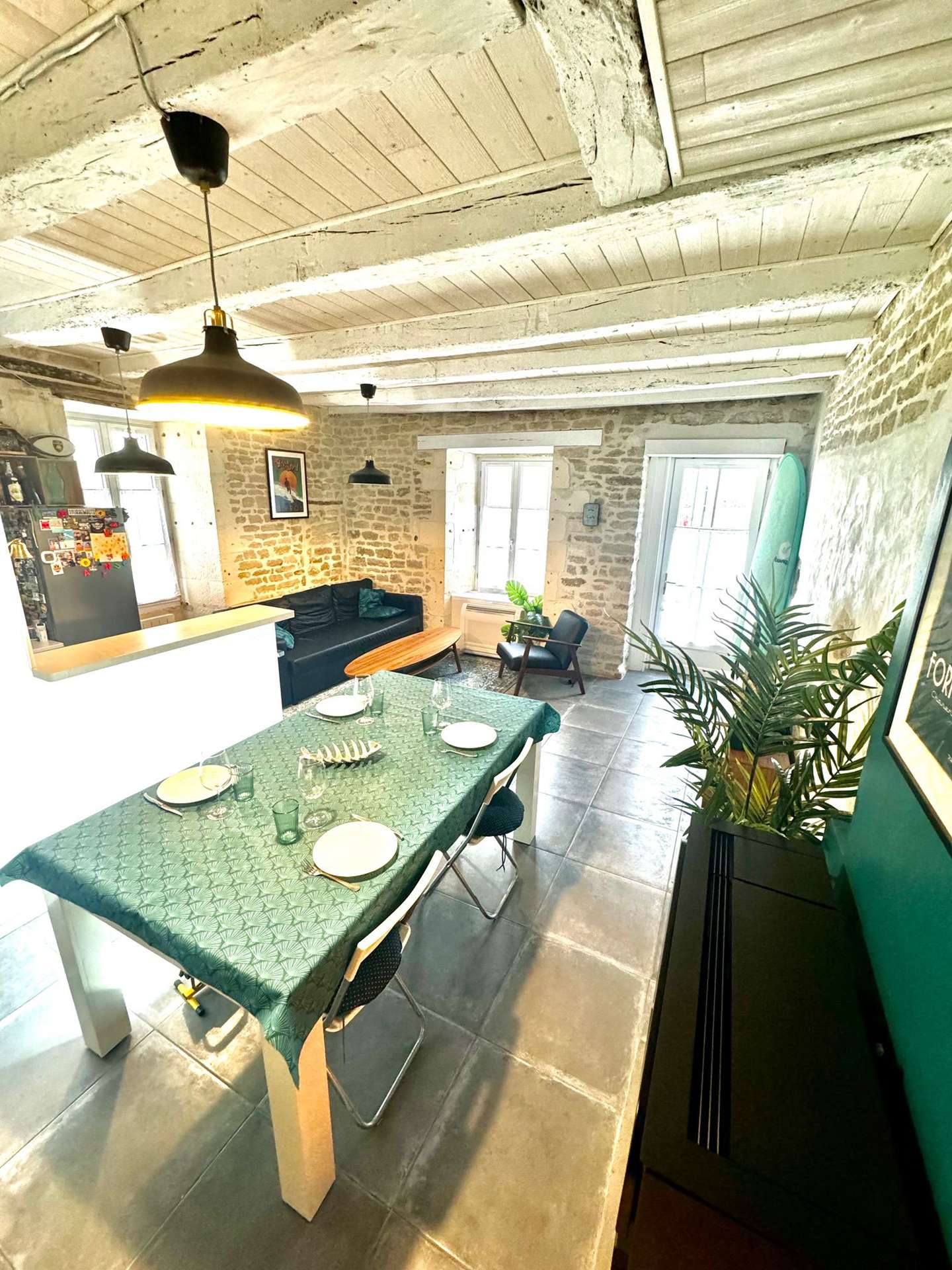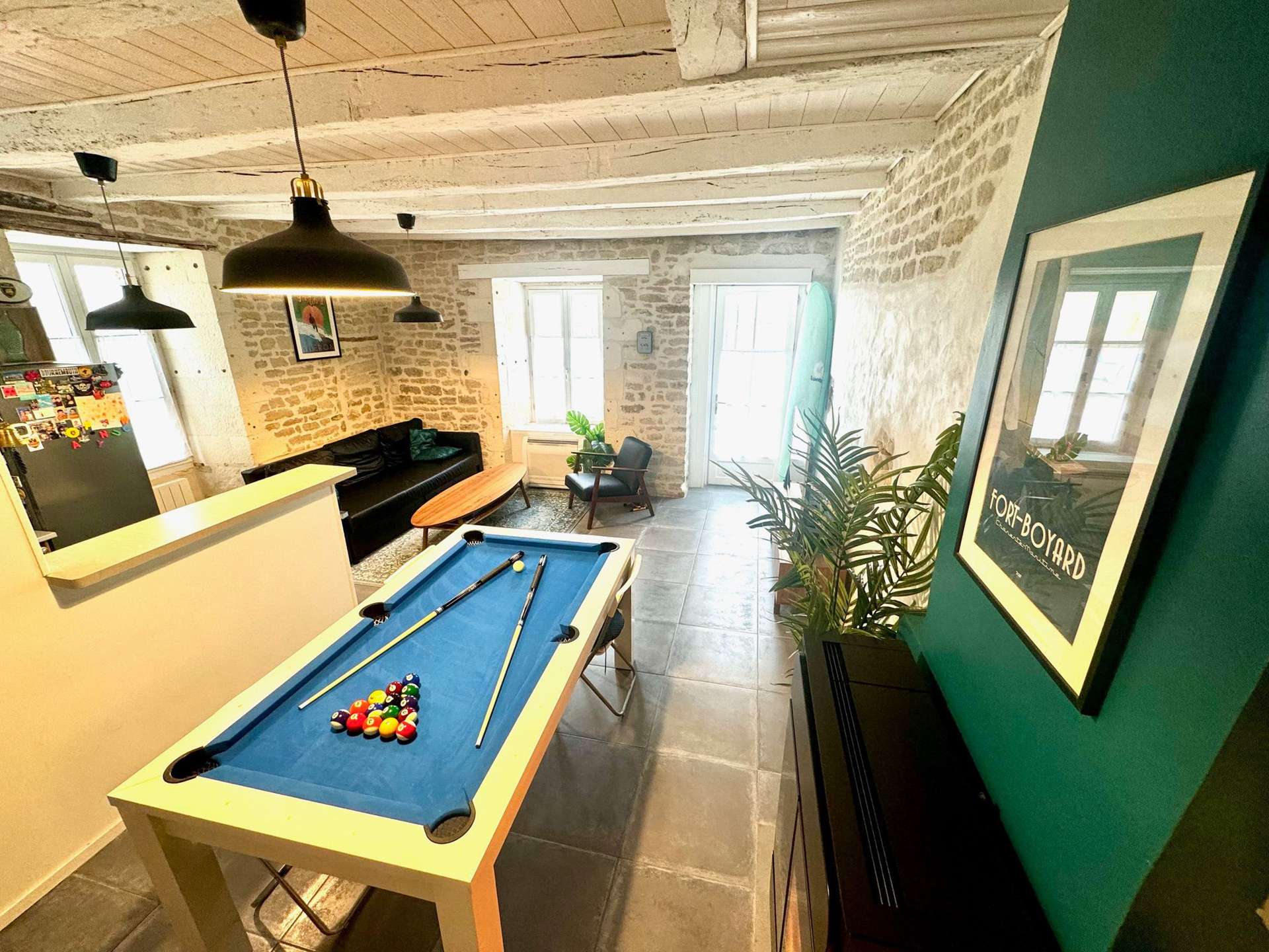 Die Unterkunft: Ein gemütliches Haus im Herzen von Château d'Oléron mit einem Wohnzimmer mit Essbereich, einer offenen, voll ausgestatteten Küche (Kühlschrank mit Gefrierfach, Backofen, Elektroherd, Mikrowelle, Wasserkocher, Toaster, Nespresso-Maschine), einem separaten WC und einem Flur mit Waschmaschine. Im Obergeschoss befinden sich ein Duschbad mit Dusche und WC, ein erstes Schlafzimmer mit zwei Einzelbetten (90 cm breites Etagenbett) und ein zweites Schlafzimmer mit zwei Einzelbetten (140 cm breit).